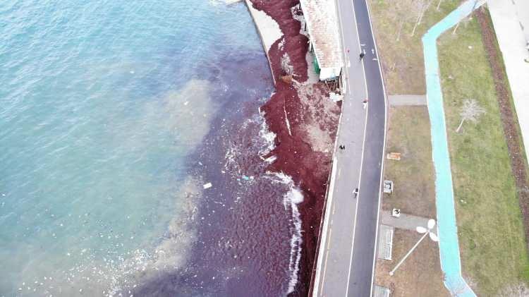 Yosunlar nedeniyle sahil ve kayalıklar kırmızı renge büründü.