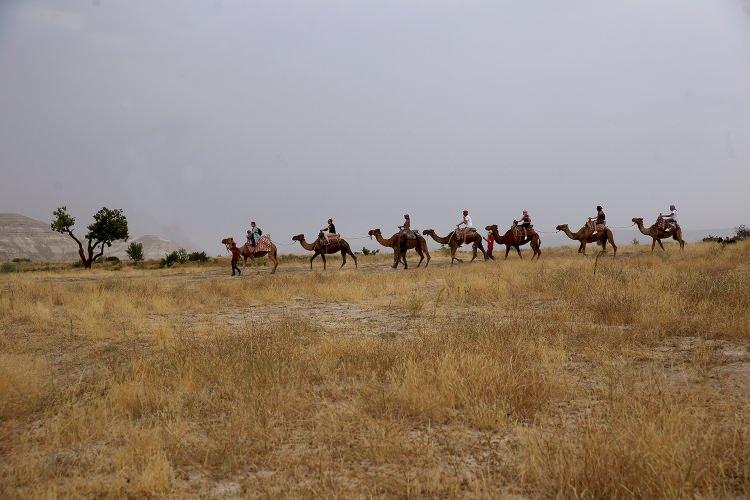 Kapadokya'nın masalsı manzarasını deve safari ile keşfediyorlar