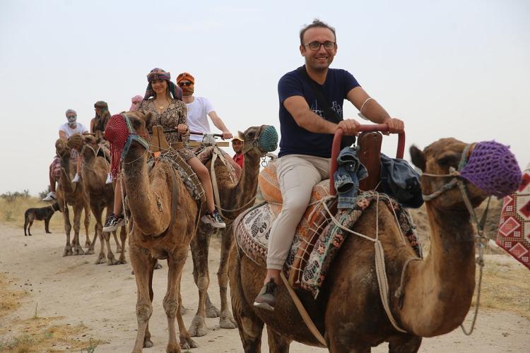Kapadokya'nın masalsı manzarasını deve safari ile keşfediyorlar