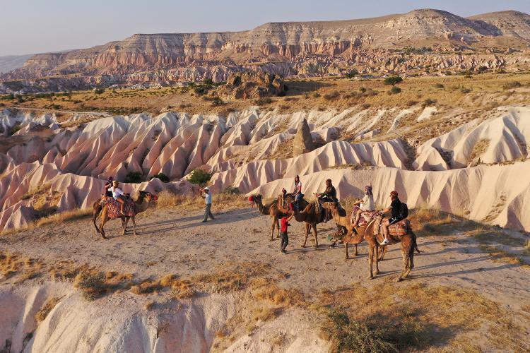 Kapadokya'nın masalsı manzarasını deve safari ile keşfediyorlar