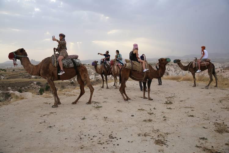 Kapadokya'nın masalsı manzarasını deve safari ile keşfediyorlar