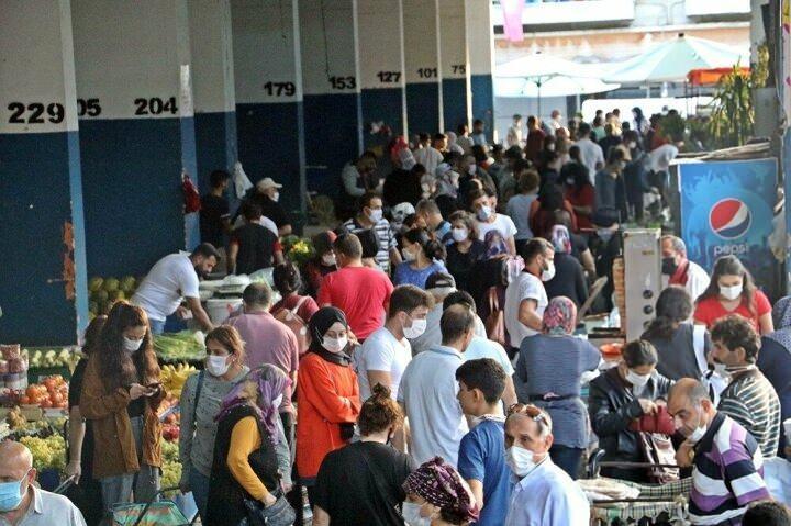 Yine bir semt pazarı yine sosyal mesafe sıfır: Vakaların tırmanışa geçmesini umursamadılar