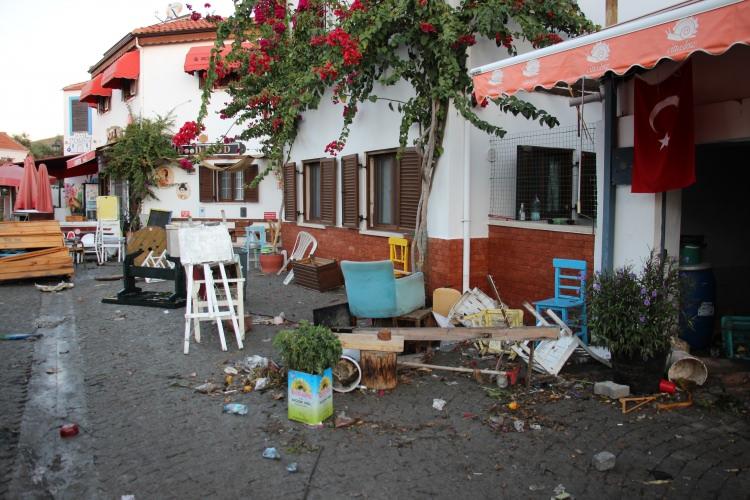 Denizden gelen dev dalgalar sahil kenarındaki işletmelere ait masa ve sandalyeleri sürükleyerek yerle bir etmişti.