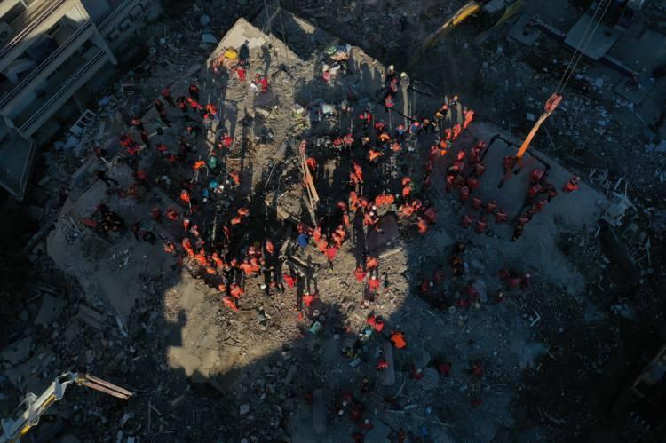 İzmir'deki depremin ardından arama kurtarma ekiplerinin, Bayraklı ilçesindeki Rıza Bey apartmanındaki arama kurtarma çalışmaları devam ediyor.