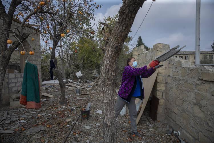 Ermenistan'ın, 17 Ekim'de orta menzilli balistik füzeyle saldırdığı ve 26 sivilin ölümüne neden olduğu Gence'de halk, bir yandan sağlam kalan eşyalarını topluyor, diğer taraftan da evlerini tamir etmeye çalışıyor.