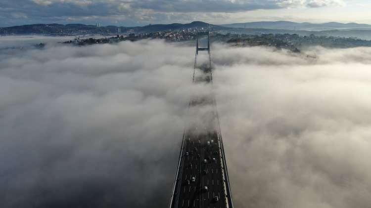 Yoğun sisin etkili olduğu İstanbul Boğazı'nda Fatih Sultan Mehmet Köprüsü ile 15 Temmuz Şehitler Köprüsü zaman zaman tamamen beyaz örtüyle kaplandı.
