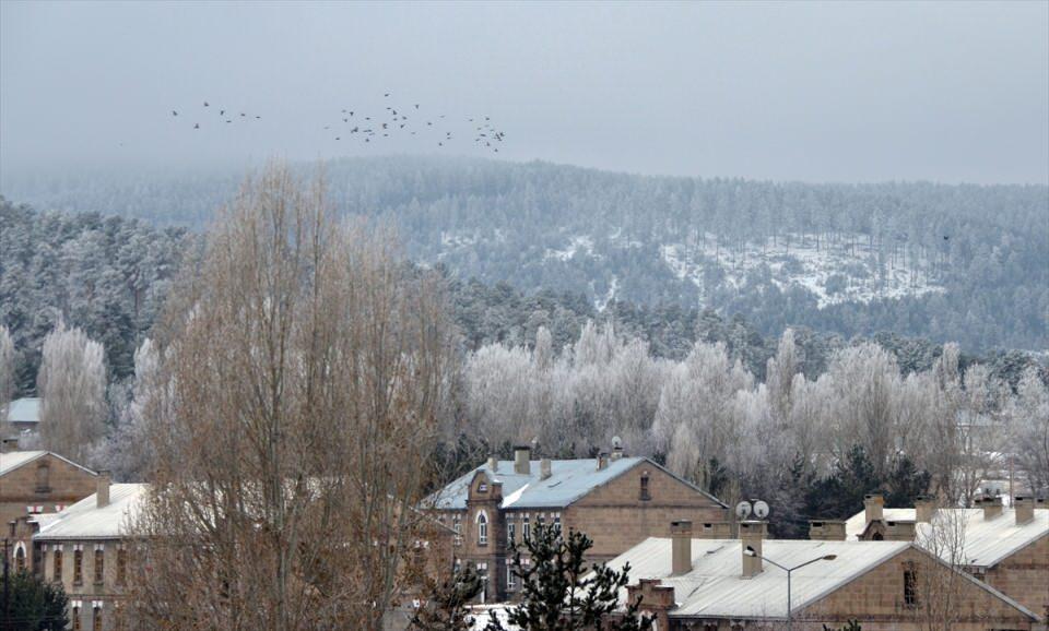 Kars'ta ağaçlar kırağıyla beyaza büründü