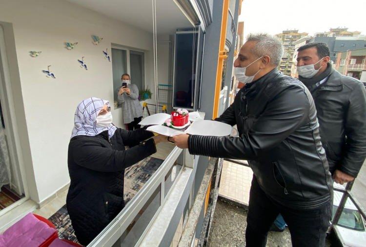 İzmir'in Buca ilçesinde, koronavirüs salgını nedeniyle uygulanan sokağa çıkma kısıtlamasında annesinin doğum gününü kutlamak isteyen radyo programı sunucusu Mustafa Karslıoğlu, vincin üstüne çıkarak balkondan pastayı teslim etti.