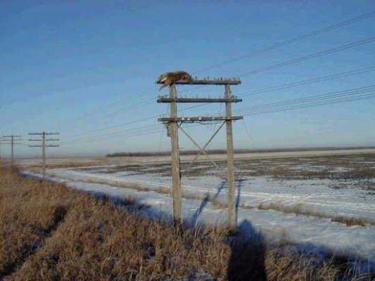2004 yılında Kanada Manitoba'da çekilen bu fotoğrafta, 7.6 metre yüksekliğindeki elektrik direğinde bir geyik mahsur kaldı. Bu fotoğrafla ilgili birkaç hikaye var: Birincisi geyiğe bir trenin çarptığı ve geyiği direğin tepesine fırladığı, diğeri de çevredeki birkaç muzip insanın böyle birşey yapmış olduğu…