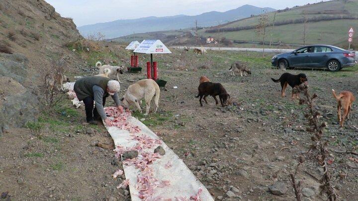 Uyar, hayvanseverlerle birlikte her ay 10 tona yakın tavuk kemiği ile kuru mama temin ederek günlük kamyonetiyle dağıtım yapıyor. Uyar'ı gören köpekler, kamyonetin peşine takılıyor, besleniyor.