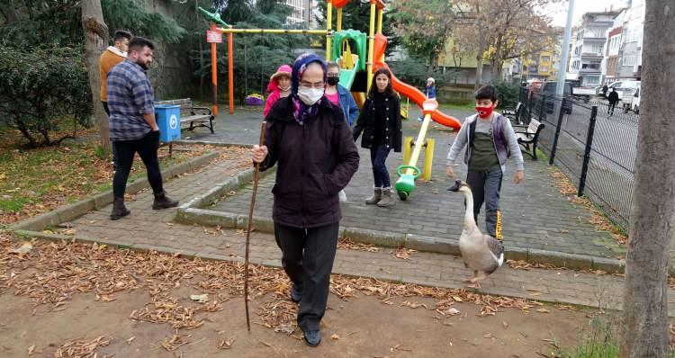 Beslediği kazla sokaklarda geziyor