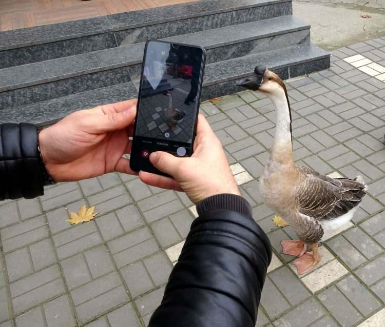 Beslediği kazla sokaklarda geziyor
