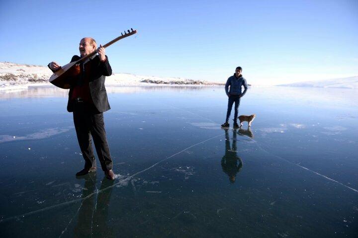 Ardahanlı ozan Yener Yılmazoğlu, yüzeyinin büyük bölümü donan Çıldır Gölü üzerinde, sazını eline alarak birbirinden güzel türküler söyledi.