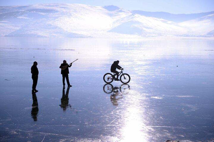 Buzla kaplı Çıldır Gölü üzerinde konser keyfi