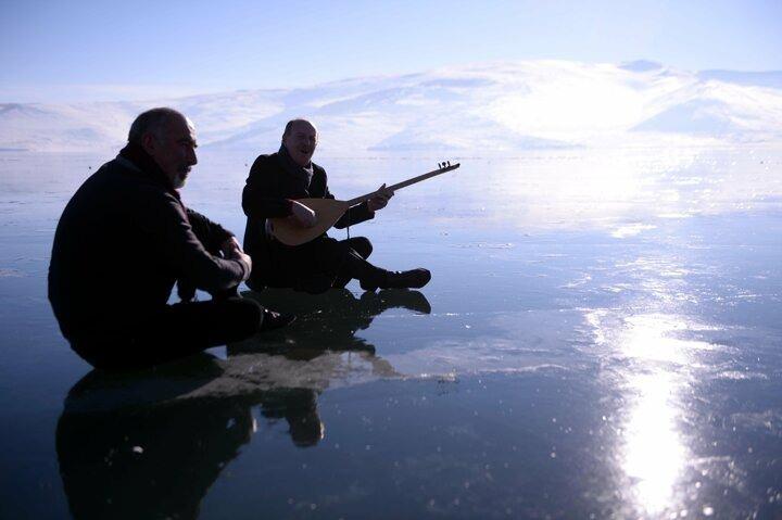 Buzla kaplı Çıldır Gölü üzerinde konser keyfi