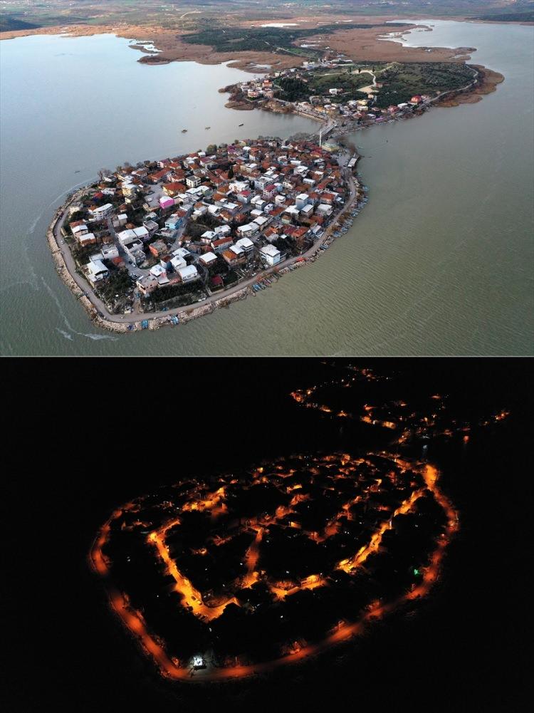 Uluabat Gölü üzerindeki Gölyazı Mahallesi, gece ve gündüz aynı açılardan drone ile görüntülendi.