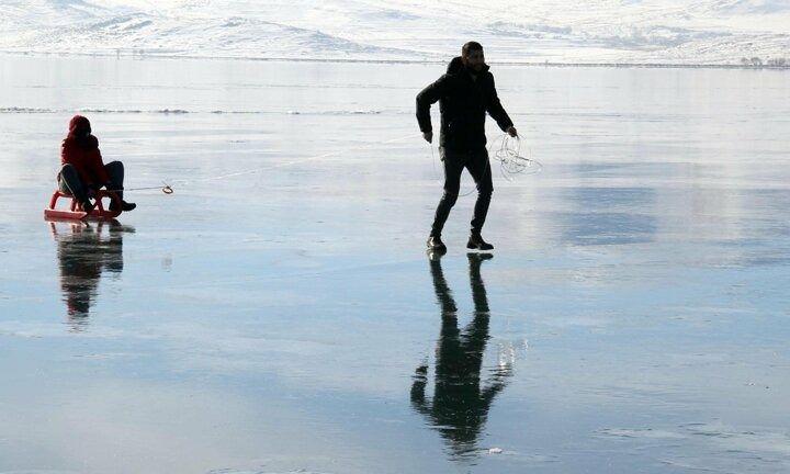 Denizden 1959 metre yükseklikteki Çıldır Gölü'nün yüzeyi, hava sıcaklığının geceleri sıfırın altında 25 dereceye kadar düşmesi nedeniyle buzla kaplandı.