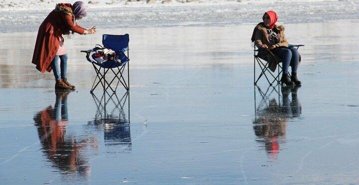 Balıkçılar, 123 bin metrekare alana sahip Çıldır Gölü'nde oluşan yaklaşık 10 santimlik buz tabakasını kırarak, Eskimo usulü balık avlarken, gölü gezmeye gelenler ise keyifli vakit geçirdi.