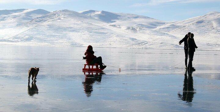 Kedilerin, gölün yüzeyindeki buz tabakasının üzerinde yürüdükleri görüldü.