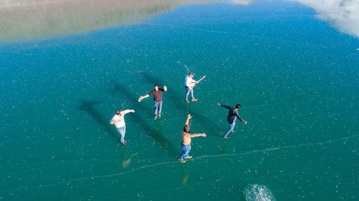 Gölde buz pateni yapan Can Uzunkaya, "Çıldır Gölü'ndeki işletmemiz pandemi nedeniyle kapalı. Gölde ayna gibi muhteşem bir buz tabakası var. Ben de çocuklarım da kızaklarla kaydık. Buraya gelen herkese ister kızak ister paten verip eğlenmesini sağlıyoruz. Onlar da hoşça vakit geçiriyor. Gölün üzerinde kar olmadığı için muhteşem bir görüntüsü var. Altta balıklar bile görünüyor. Bu görüntü çoğu zaman olmaz. Kar yağmadan herkesin bu manzarayı görmesi gerek" dedi.