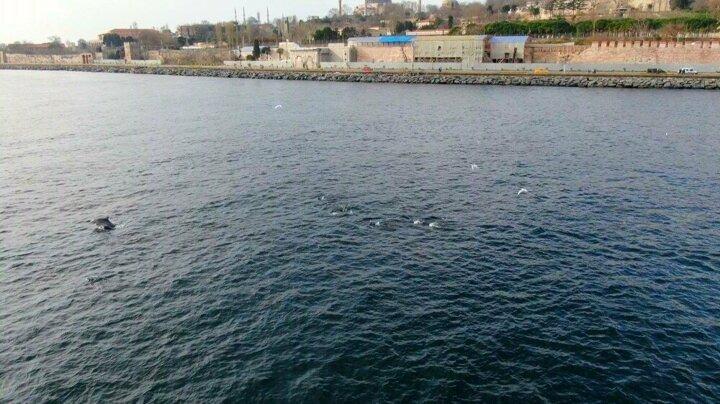 Koronavirüs tedbirleri kapsamında getirilen sokağa çıkma kısıtlaması ile deniz trafiği de azalınca İstanbul Boğaz'ın bir çok noktasında yunuslar ortaya çıktı. Turistler boğazın serin sularına defalarca dalıp çıkan yunusları cep telefonlarıyla görüntüledi.