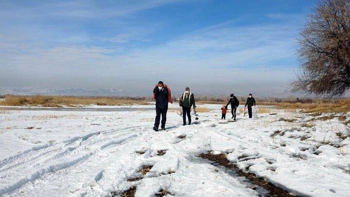 Buz tutan gölde mangal yakıp piknik yaptılar