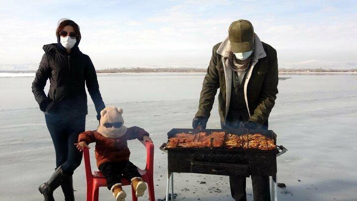 Buz tutan gölde mangal yakıp piknik yaptılar