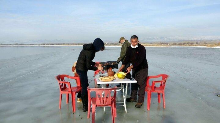 Buz tutan gölde mangal yakıp piknik yaptılar