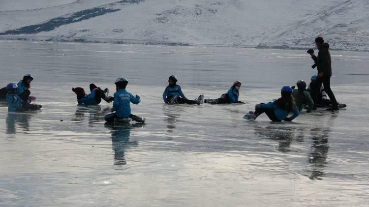Gençlik ve Spor İl Müdürlüğünde görevli short-track (buz pateni) antrenörü Leyla Yılmaz öncülüğünde 15 sporcunun, yüzeyi cam gibi bir buz tabakasıyla kaplanan göl üzerinde 30 dakikalık paten gösterisi ilgiyle izlendi.