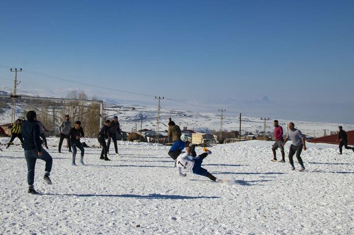 Kış mevsiminin zorlu geçtiği bölgede yaşayan gençler, günlük hayvan bakım işlerini yaptıktan sonra boş zamanlarını futbol oynayarak değerlendiriyor.