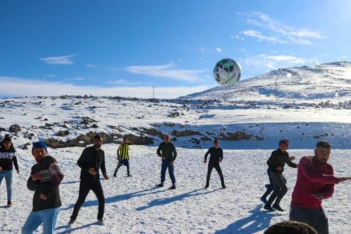 Iğdır'da kardan zaman zaman yolu kapanan dağ köylerinde yaşayan vatandaşlar, zorlu kış koşullarını, kar üzerinde futbol turnuvası düzenleyerek eğlenceye dönüştürüyor.Kış mevsiminin zorlu geçtiği bölgede yaşayan gençler, günlük hayvan bakım işlerini yaptıktan sonra boş zamanlarını futbol oynayarak değerlendiriyor. Gençlerin civar köylerden kişilerin de katılımıyla oluşturduğu takımlar, Alibey köyündeki futbol sahasında belirlenen zamanlarda kar tabakasının üzerinde soğuk havaya rağmen maç yapıyor.