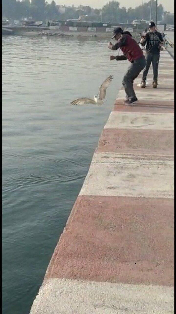 Mersin'de sahilde balık tutan bir vatandaşın oltasına, martı takıldı. Balık için atılan oltaya takılan martı, vatandaş tarafından sahile çıkartılarak kurtarıldı.