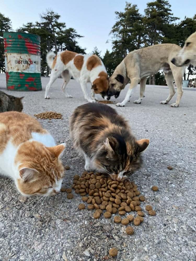 Kilometrelerce yol aştıktan sonra bir dağ eteğinde, ormanlık alanda veya ırmak kenarında kamp kuran Akdağ, karşılaştığı sokak hayvanlarını besleyip çevreyi de temizliyor.