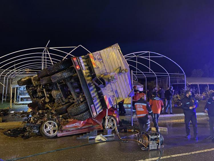 Feci kaza: Kamyon 2 aracın üzerine devrildi