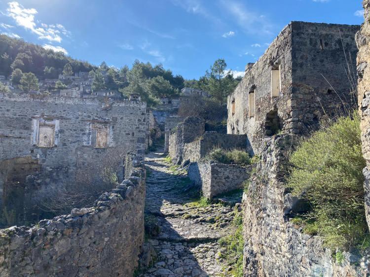 Kış aylarının puslu havasındaki güzelliğiyle kartpostallık görüntüler sunan Kayaköy, pandemiye rağmen yöreye gelen turistlerin uğramadan geçmediği yerlerden biri oluyor.