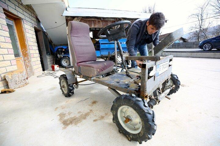 Önce hurdacıdan demir profil ve sac temin eden Yılmaz, daha sonra otomobil direksiyonu, sürücü koltuğu ve aracın "alt takımı" diye tabir edilen rot ve teker sistemlerini alarak birleştirdi.
