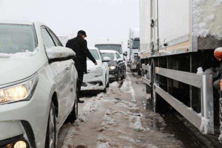 Kar nedeniyle ilerleyemeyen araçlar, yolda uzun kuyruklar oluşturdu. Bazı araç sahipleri, araçlarına zincir takarken bazı sürücüler ise yolun açılmasını bekledi.