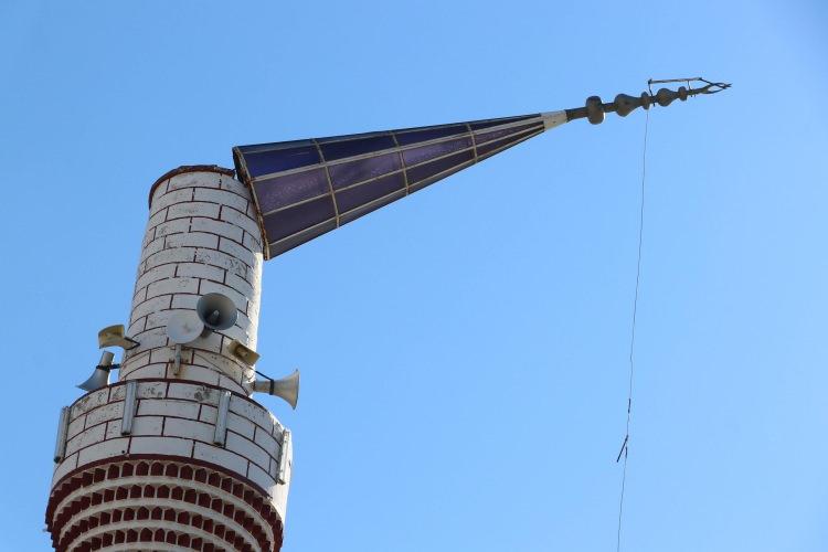 Şiddetli rüzgar nedeniyle caminin külahı askıda kaldı