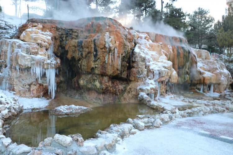 Dondurucu soğuk nedeniyle sıcak su şelalesi buz tuttu