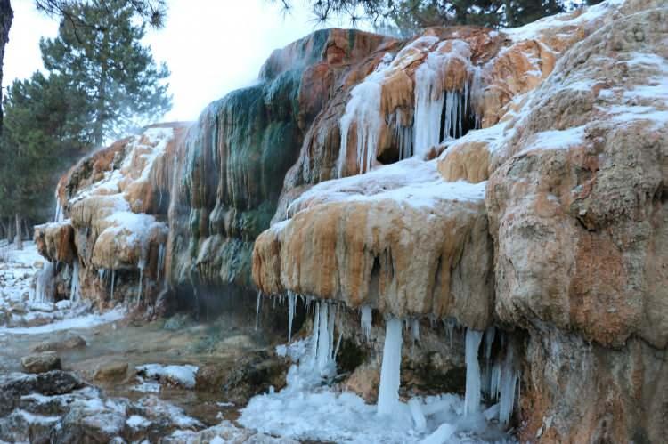 Dondurucu soğuk nedeniyle sıcak su şelalesi buz tuttu