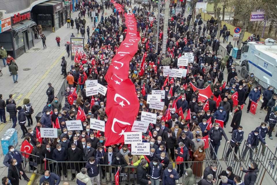 Ellerinde Türk bayraklarıyla, "Van teröre karşı tek yürek", "PKK bitecek acı dinecek", "Teröre karşı omuz omuza" pankartları açan kent sakinleri, çeşitli sloganlar atarak Hazreti Ömer Camisi avlusuna kadar yürüdü.