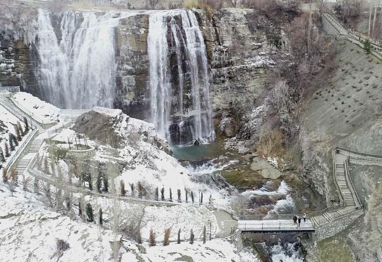 3 gün önce yağan karın ardından çevresi beyaz örtüyle kaplanan şelalenin korkulukları soğuk havada buzla kaplandı.