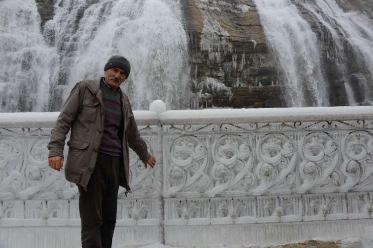 Soğuk hava nedeniyle şelale korkuluklarında değişik desenlerde buzlar oluştuğunu belirten Ata, beyaz örtüsü ve buz dekorasyonuyla farklı güzellik meydana geldiğini kaydetti.