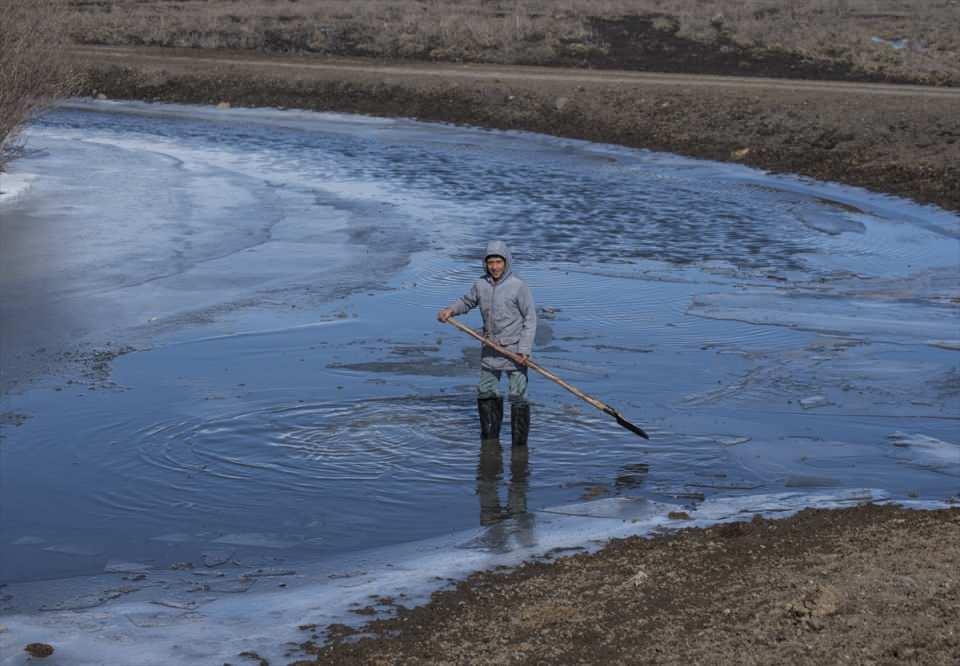 Besiciler hayvanlarının su ihtiyacını karşılayabilmek için donan derelerin buzlarını kırdı.