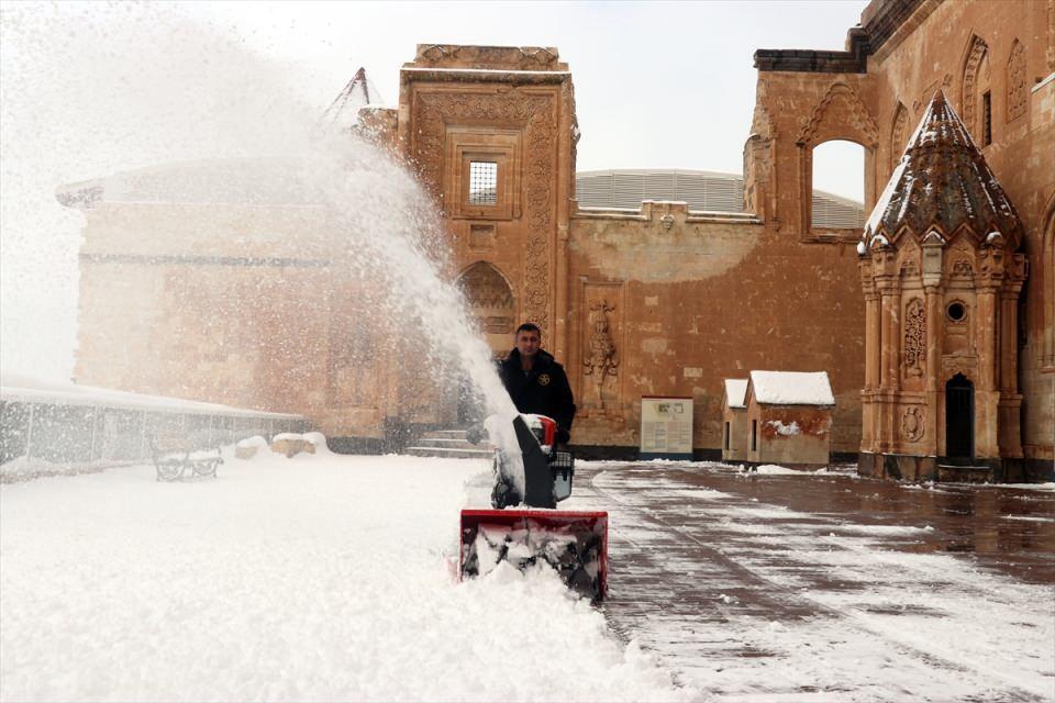 Ekipler, kar püskürtme makinesi ve küreklerle tarihi saraydaki karları temizledi.