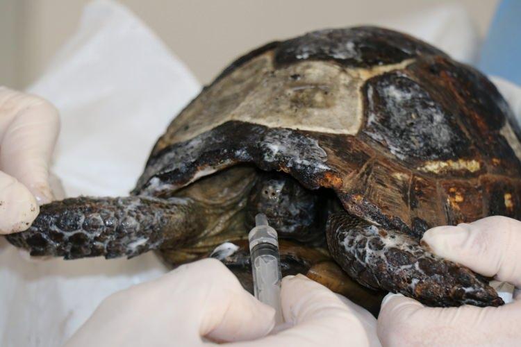 Alanya'daki orman yangınında alevler arasından çıkan kaplumbağa tedaviye alındı