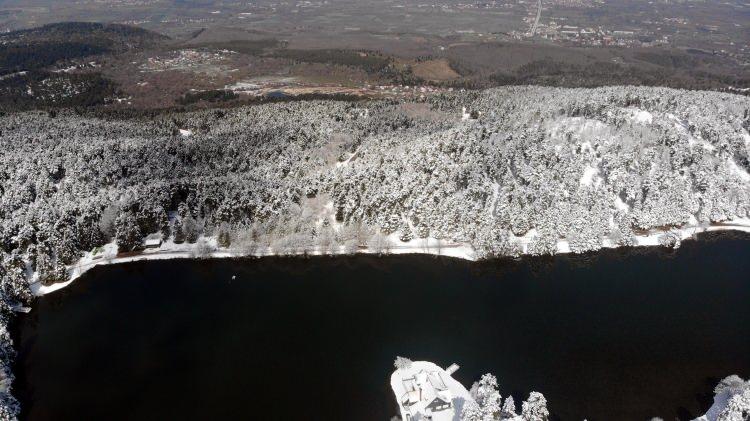 Bolu'da, çam ormanlarının arasında saklı Gölcük Tabiat Parkı kar yağışı ile beyaza büründü. Seyrine doyumsuz manzara, dron ile havadan görüntülendi.