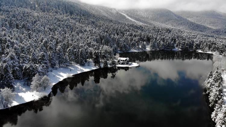 Beyaz örtünün serili olduğu tabiat parkı görenleri hayran bıraktı. Gölcük Tabiat Parkı'nda ağaçların göle yansıması eşsiz görüntüler oluşturdu. Bu güzel manzara, dron ile havadan görüntülendi.