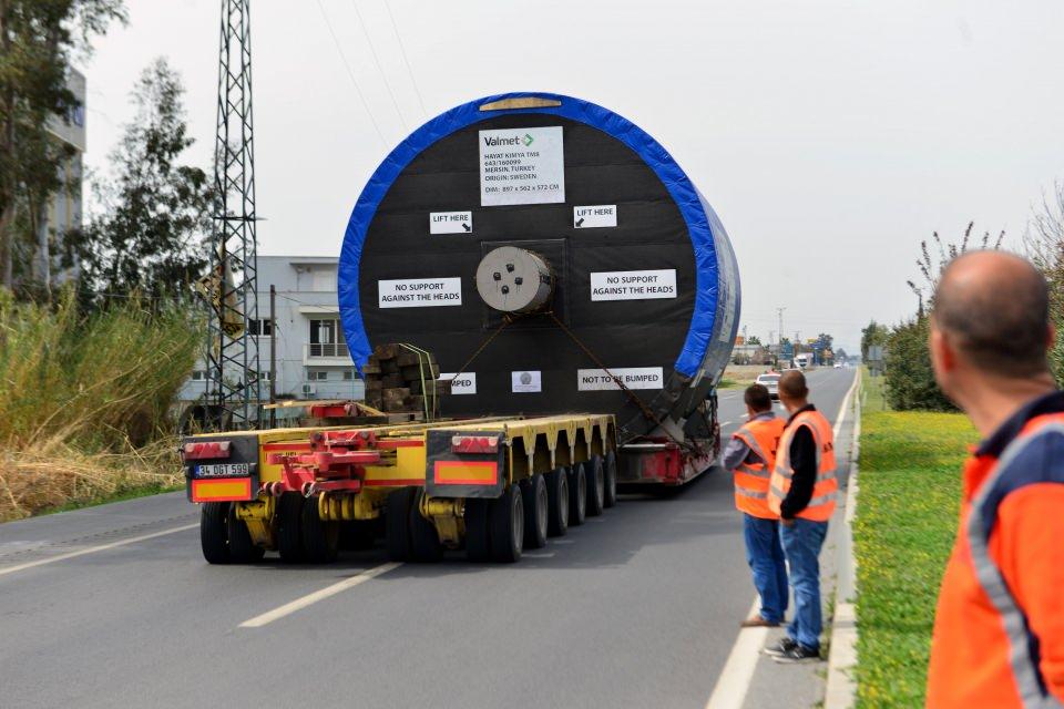 İsveç’ten gemiyle İskenderun Limanı’na getirilen, bir taşıma şirketinin 5 kişilik ekip ve özel tasarlanan TIR ile teslim aldığı 147.5 tonluk kağıt sarma ve hamur kurutma üretiminde kullanılan silindir, Mersin’de Tarsus Organize Sanayi Bölgesi’ndeki bir tesise ulaştırılmak üzere 12 Mart Cuma günü yola çıktı.
