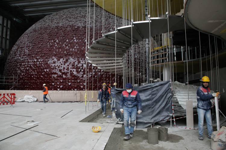 Taksim Meydanı'ndan gözüken fin cephe yapımının yüzde 70'i tamamlanan AKM'nin iç mekanlarındaki ince iş, asma tavan, cam bölme ve doğrama ile zemindeki taş çalışmaları sürüyor.